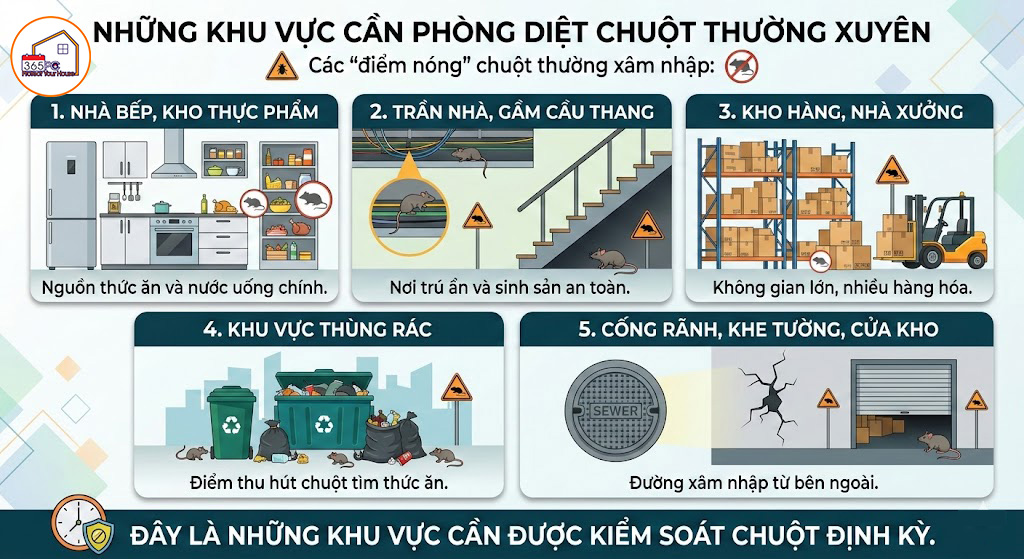 Đây là những khu vực cần được kiểm soát chuột định kỳ.